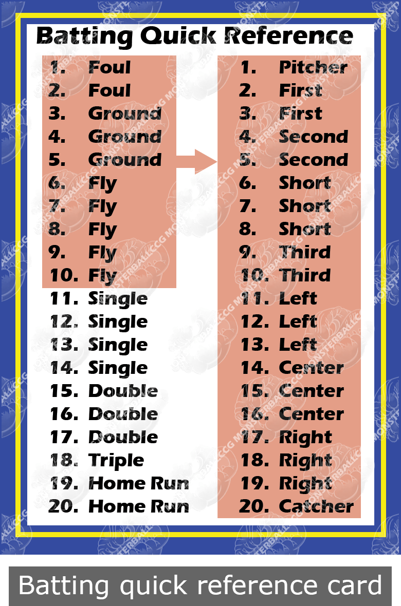 In addition to choosing which monster will play each fielding position both managers must decide the order in which their players will bat. Premade decks come with a batting lineup card that you can fill out so you don’t forget your lineup, but a note card or a scrap of paper will work just as well. Once both managers have made their fielding and lineup choices and inspected and approved the other manager’s choices, it’s time to play some monsterball!.