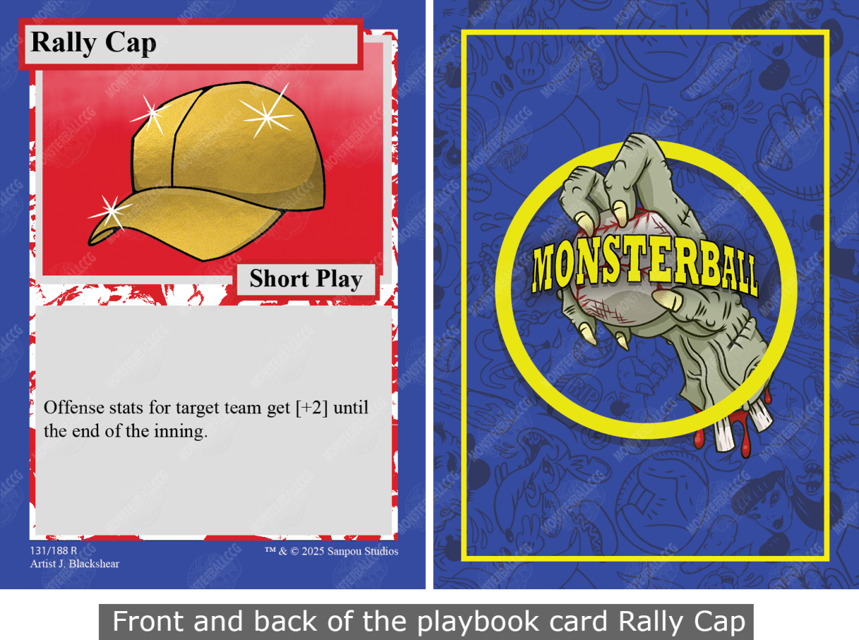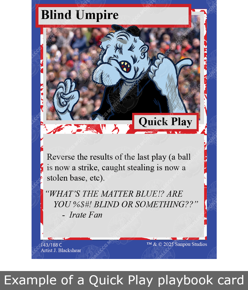 Playbook cards have the artwork and mechanics of the card on the front of each card. The back of each playbook card features the Monsterball logo.
