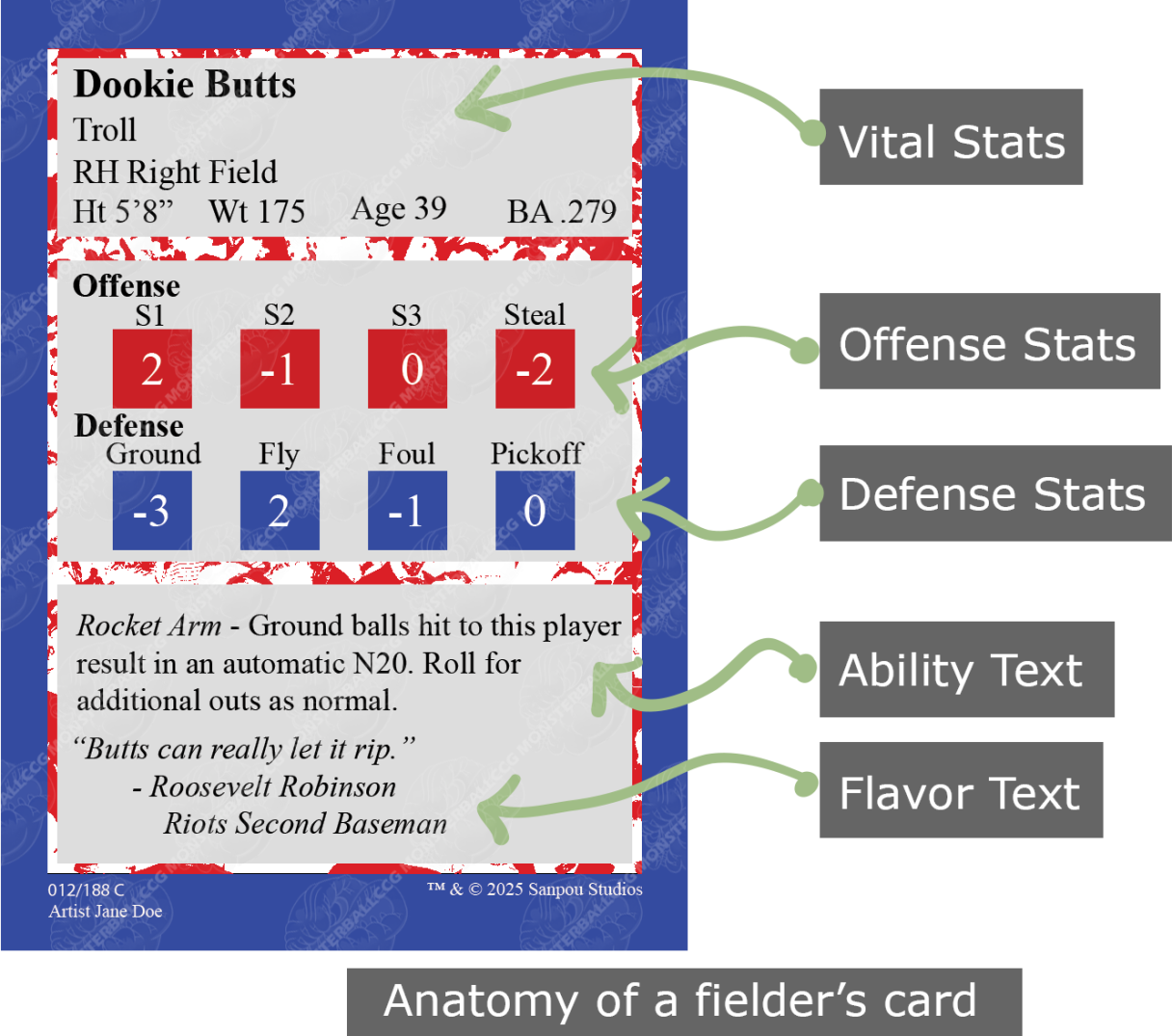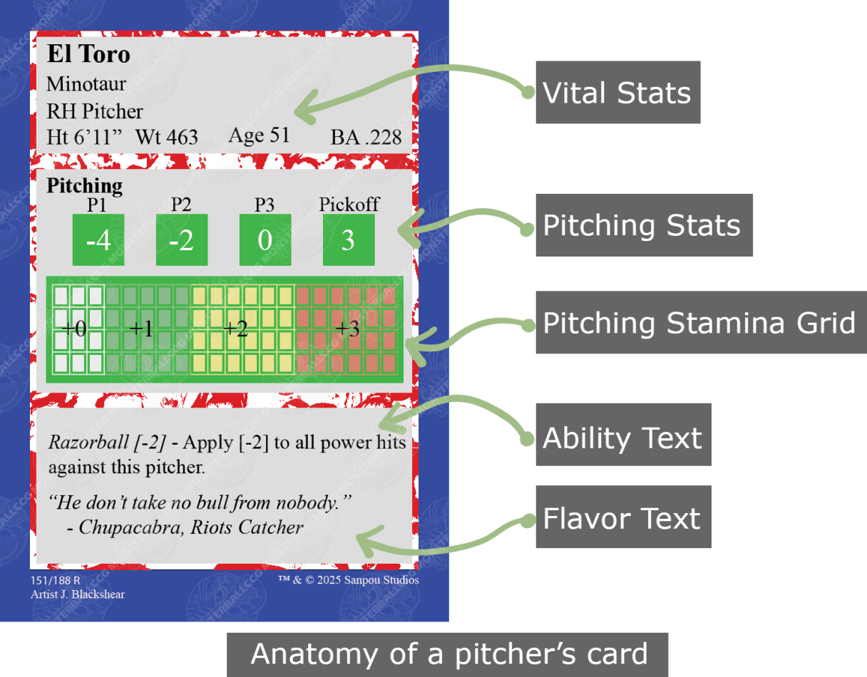 The front side of both a fielder’s card and a pitcher’s card list everything you need to know about the player to play a game of monsterball.