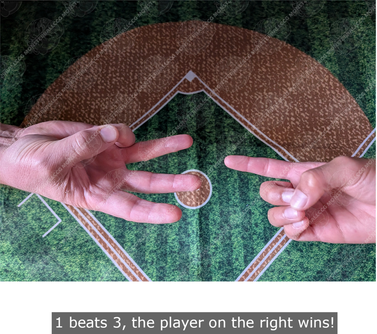 Battles between pitchers and batters are decided by both managers throwing fingers - this is one of the most important parts of monsterball and your time to shine as a manager! Throwing or throwing fingers works like this: both managers hold up a fist. They count 1 - 2 - 3 - THROW! and then show either 1, 2, or 3 fingers.