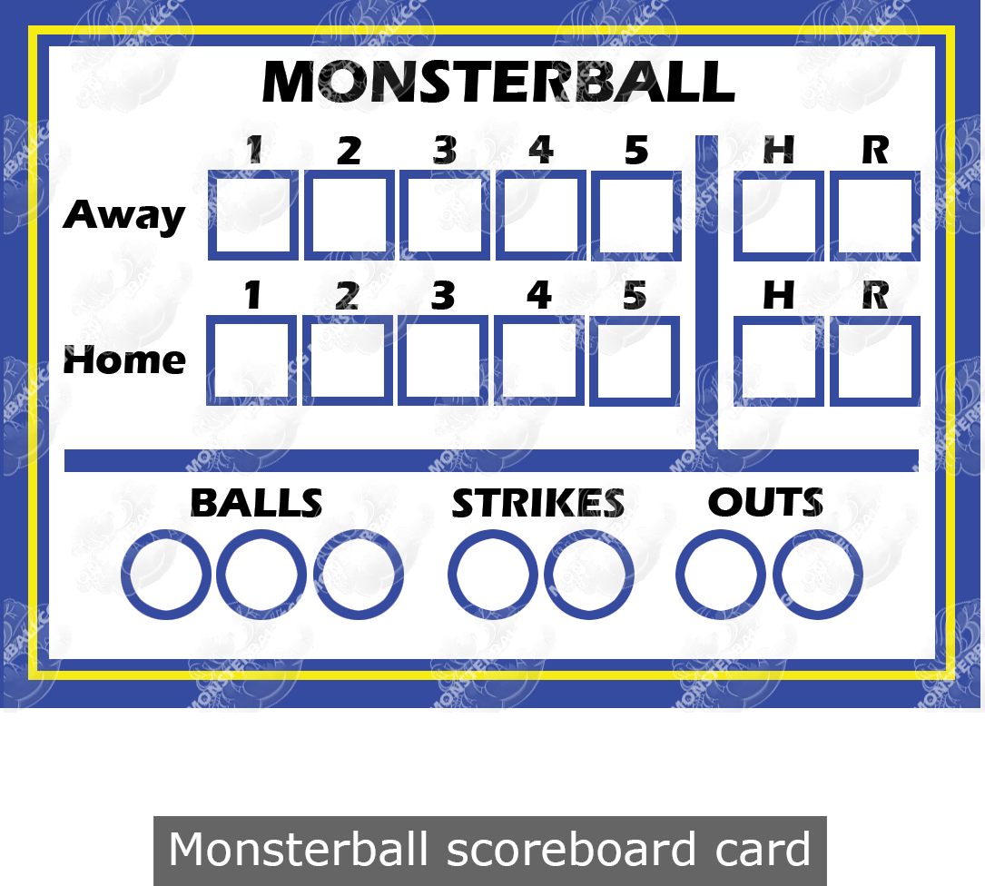 Each game of monsterball is divided into 5 innings. During the first half of each inning, also called the “top” of the inning, the away team plays offense (they bat), and the home team plays defense (they take the field and pitch). During the second half of the inning, also called the “bottom” of the inning, the home team plays offense and the away team plays defense. To help keep track of the innings (and just about everything else), premade monsterball team decks come with a scoreboard card that you can use to tally the score, the innings, balls, strikes, and outs - but a notecard or piece of paper will work just as well.