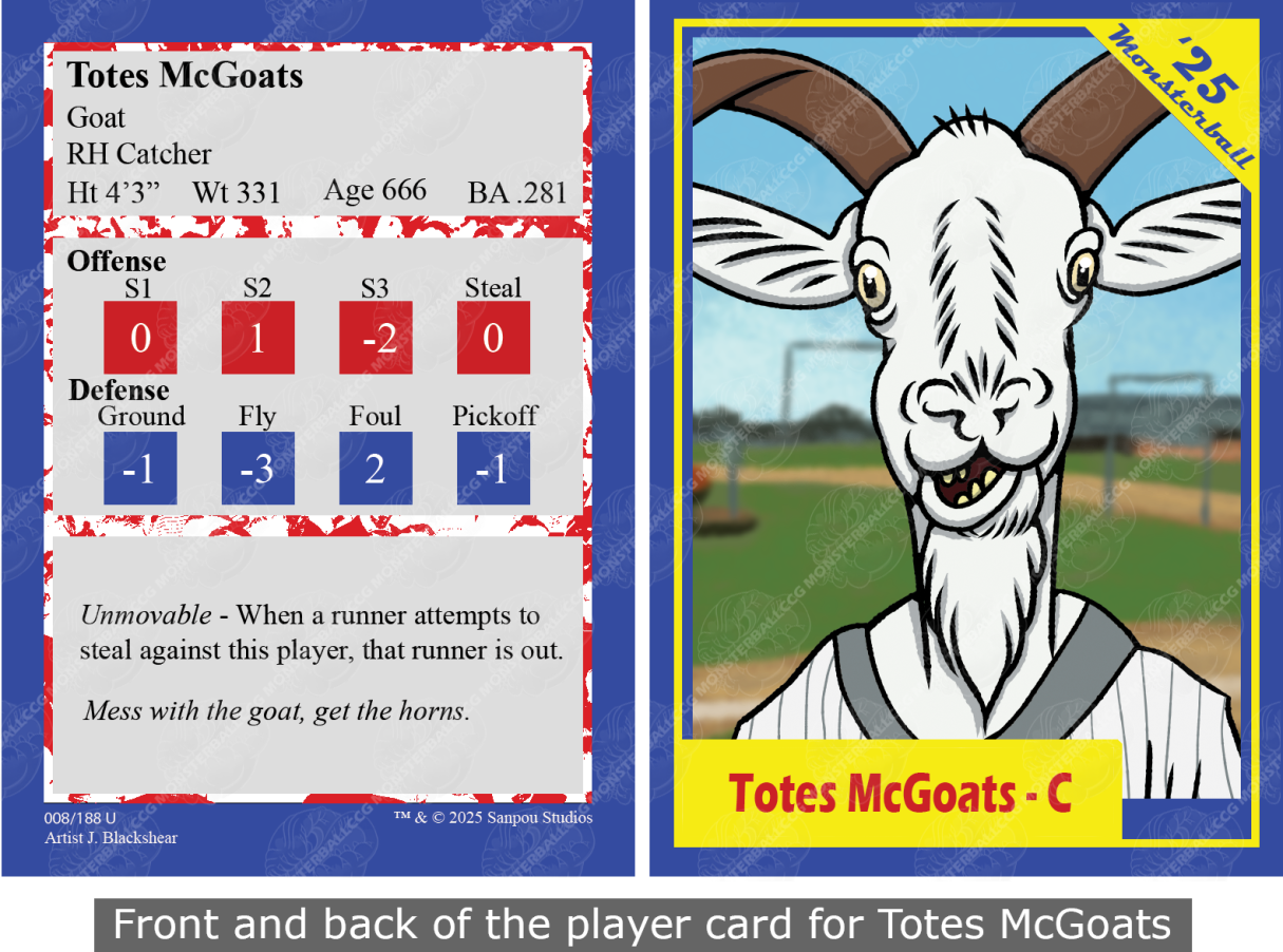 The front side of both a fielder’s card and a pitcher’s card list everything you need to know about the player to play a game of monsterball.